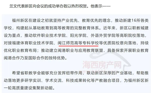 2024年10月26日举行的福建省职业技术教育学会第七届会员代表大会暨职业教育产教融合高质量发展论坛上,福州新区党工委副书记、管委会主任兰文透露,对接福建体育职业技术学院、闽江师范高等专科学校等优质院校意向落地,持续优化职业教育布局。