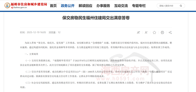 海西房产网(微信公众号:fjhxfcw)消息:12月19日,福州住建局官网发布一则消息,介绍保交房稳民生进展情况。