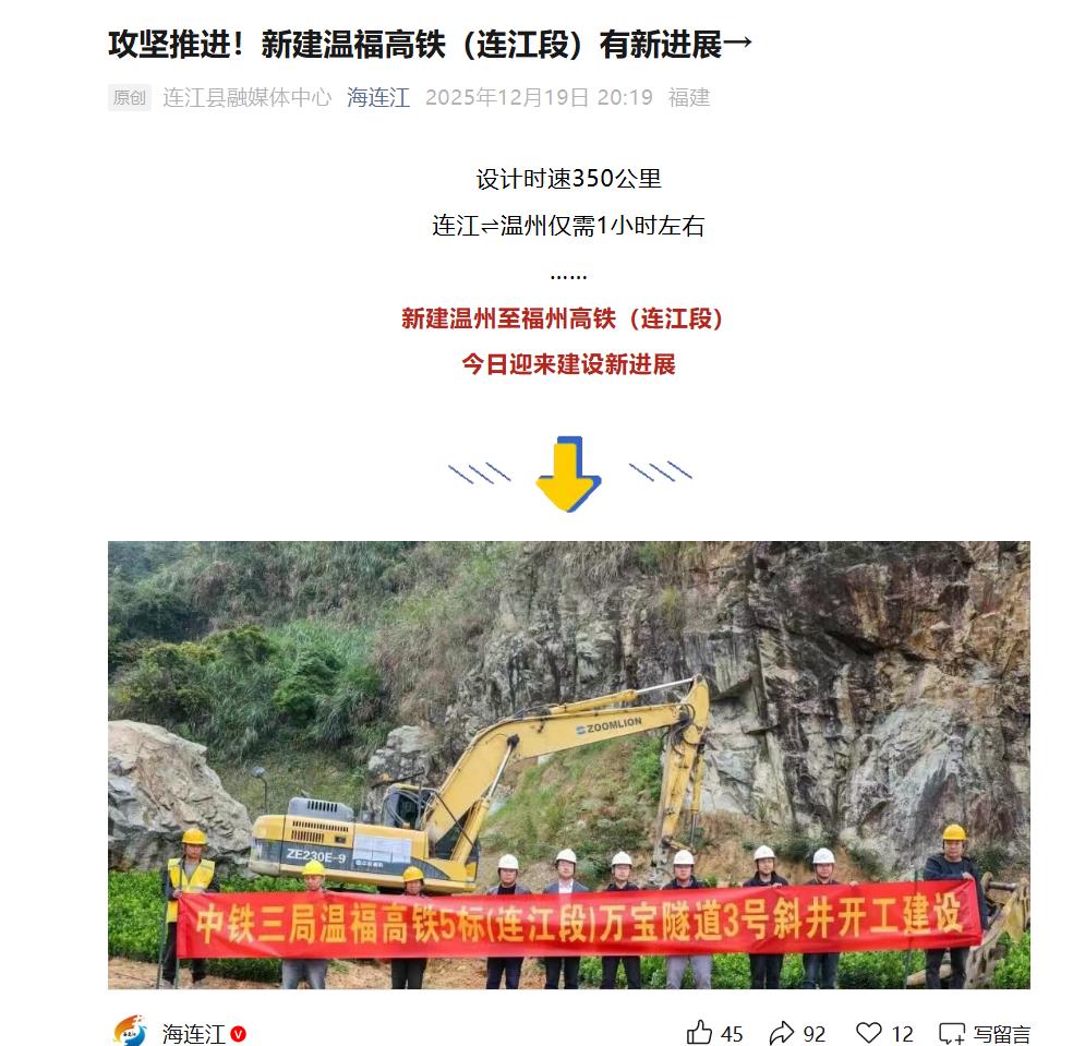 2025年12月19日,据连江县融媒体中心报道,当天上午,由中铁三局承建的新建温州至福州高铁(连江段)的万宝隧道3号斜井正式开工建设。