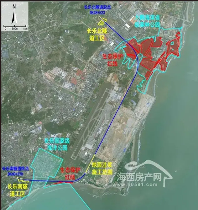 F2、F3线长乐机场段工程位于福州新区国际航空城,起于长乐区湖南镇,终于漳港街道百户片区,全长11.8公里,总投资约68亿元,预测土建洞通工期需63个月,是全线工期最长的一段。