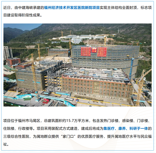 海西房产网(微信公众号:fjhxfcw)消息:中建海峡对外透露,近日由该公司承建的福州经济技术开发区医院新院项目实现主体结构全面封顶,标志项目建设取得阶段性成果。
