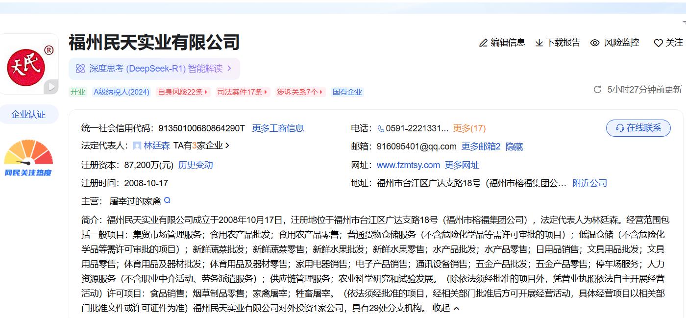 福州民天实业有限公司为福州市属国有农副产品批发市场运营企业,是福州市重点"菜篮子"工程实施主体,经营管理海峡农副产品物流中心及其下属五大专业批发市场。该企业通过建设"智慧食安"管理系统实现全品类溯源监管,日均采集交易数据超4万条并接入省市监管平台,所属检测机构执行"入场批批检"标准。