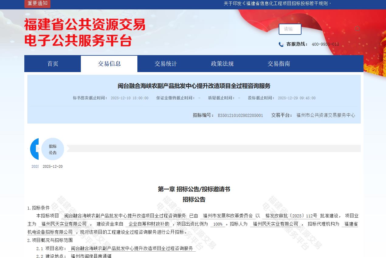 海西房产网(微信公众号:fjhxfcw)消息:2025年12月20日,福州市公共资源交易服务中心 发布“闽台融合海峡农副产品批发中心提升改造项目全过程咨询服务”。