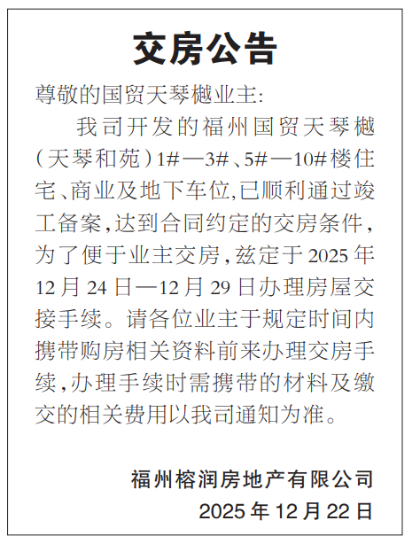 公告指出,福州榕润地产开发的国贸天琴樾(天琴和苑)1#—3#、5#—10#楼住宅、商业及地下车位已顺利通过竣工备案,达到合同约定的交房条件,为了便于业主交房,兹定于 2025 年12 月 24日—12月29日办理房屋交接手续。
