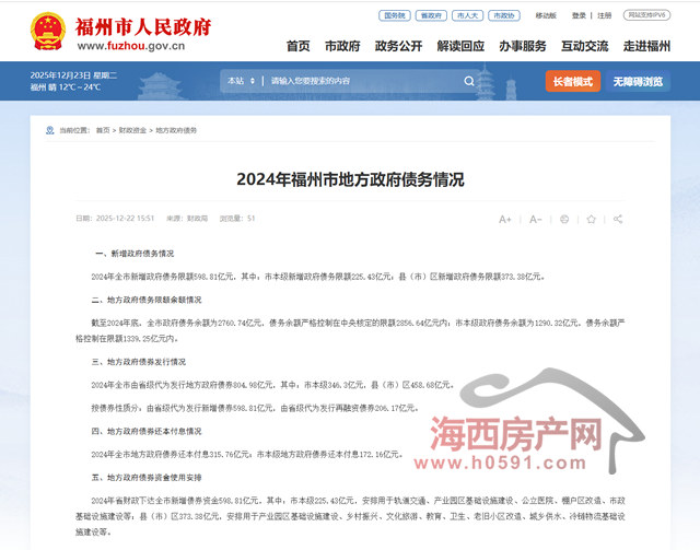 海西房产网(微信公众号:fjhxfcw)消息:12月22日,财政局公布“2024年福州市地方政府债务情况”。