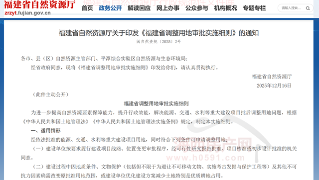 海西房产网(微信公众号:fjhxfcw)消息:近日,福建省自然资源厅下发“关于印发《福建省调整用地审批实施细则》的通知(闽自然资规〔2025〕2号)”。