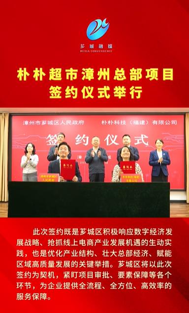 仪式上,芗城区领导介绍,此次签约既是芗城区积极响应数字经济发展战略、抢抓线上电商产业发展机遇的生动实践,也是优化产业结构、壮大总部经济、赋能区域高质量发展的关键举措。希望朴朴集团能够以漳州总部项目为起点,加快项目建设进度,早日投产运营,与芗城携手并肩、互利共赢,共同书写线上电商产业发展的新篇章。芗城区将以此次签约为契机,紧盯项目审批、要素保障等各个环节,为企业提供全流程、全方位、高效率的服务保障。