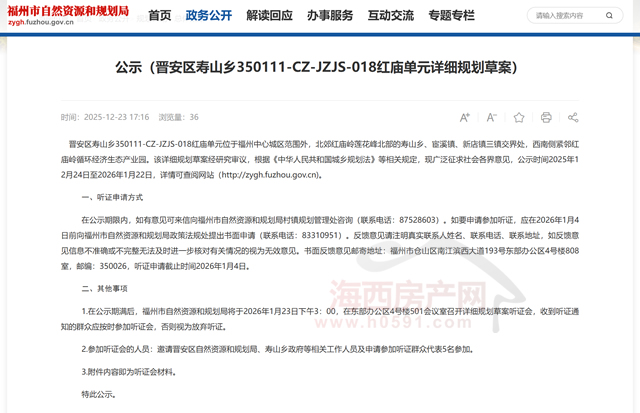 海西房产网(微信公众号:fjhxfcw)消息: 2025年12月23日, 福州市自然资源和规划局发布“晋安区寿山乡350111-CZ-JZJS-018红庙单元详细规划草案公示”。
