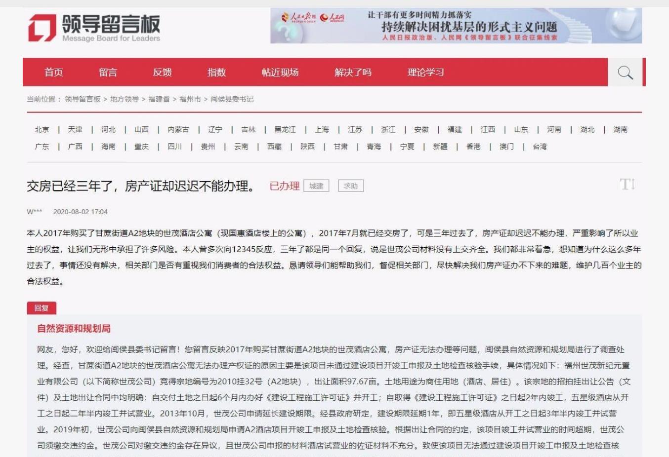 下一步,闽侯县自然资源和规划局将继续跟踪催促世茂公司提供相关材料,尽快予以办理土地检查核验房产登记手续。
