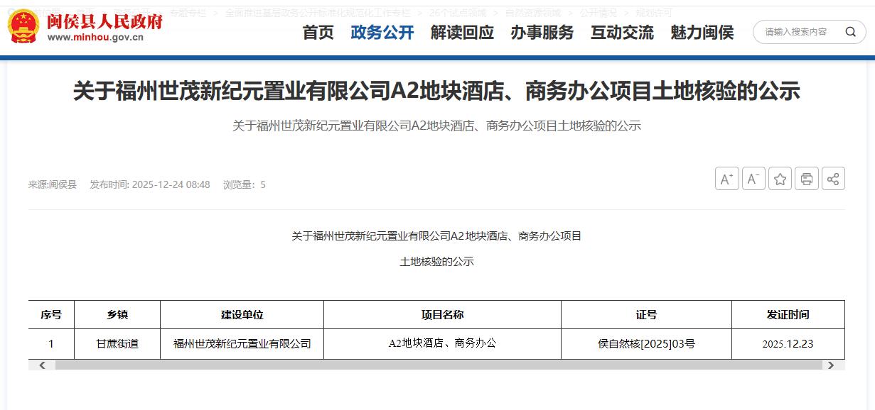 海西房产网(微信公众号:fjhxfcw)消息:2025年12月24日,闽侯县政府官网发布“关于福州世茂新纪元置业有限公司A2地块酒店、商务办公项目土地核验的公示 ”。