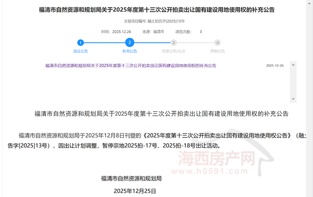 补充公告显示,福清市自然资源和规划局于2025年12月8日刊登的《2025年度第十三次公开拍卖出让国有建设用地使用权公告》(融土拍告字[2025]13号),因出让计划调整,暂停宗地2025拍-17号、2025拍-18号出让活动。