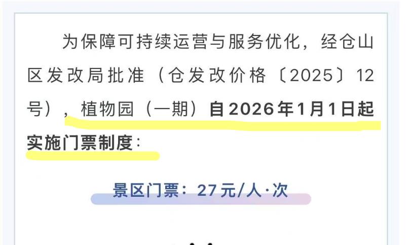 为保障可持续运营与服务优化,经仓山区发改局批准(仓发改价格〔2025〕12号),植物园(一期)自2026年1月1日起实施门票制度:景区门票:27元/人·次。