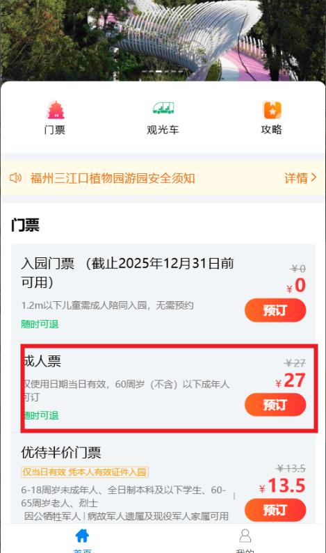 小编登陆福州三江口植物园小程序,门票预约显示,2025年12月31日前入园门票为0元。成人票为27元,优先半价门票为13.5元。观光车票为3元。