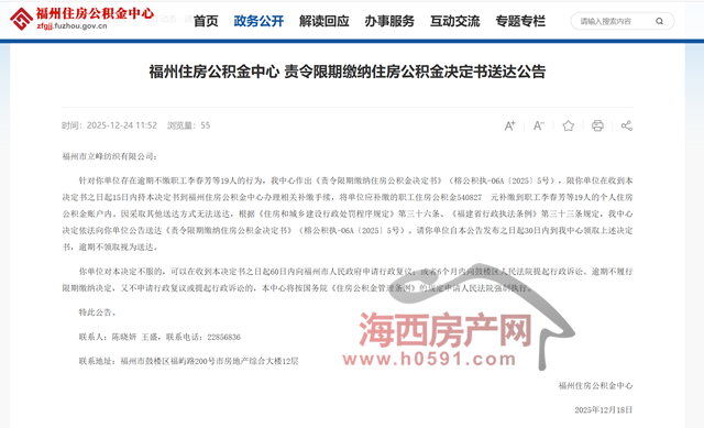 公告显示,福州市立峰纺织有限公司存在逾期不缴职工李春芳等19人的行为,福州住房公积金中心作出《责令限期缴纳住房公积金决定书》(榕公积执-06A〔2025〕5号),限福州市立峰纺织有限公司在收到本决定书之日起15日内持本决定书到福州住房公积金中心办理相关补缴手续,将单位应补缴的职工住房公积金540827 元补缴到职工李春芳等19人的个人住房公积金账户内。