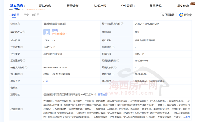 通过天眼查获悉,福建抚商置业有限公司于2025年11月28日注册成立,注册位置位于福建省福州市晋安区新店镇南平东路109号二层A440,法定代表人为王军球。