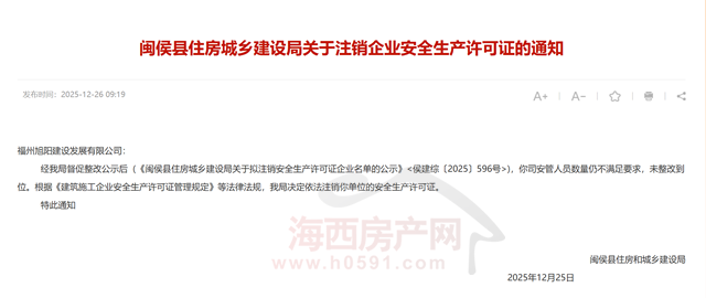 “通知”指出,经闽侯县住建局督促整改公示后(《闽侯县住房城乡建设局关于拟注销安全生产许可证企业名单的公示》<侯建综〔2025〕596号>),福州旭阳建设发展有限公司安管人员数量仍不满足要求,未整改到位。