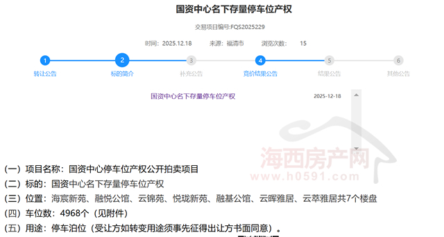 据悉,本次挂牌转让的车位为国资中心名下存量停车位产权,涉及海宸新苑、融悦公馆、云锦苑、悦珑新苑、融基公馆、云晖雅居、云萃雅居共7个楼盘。