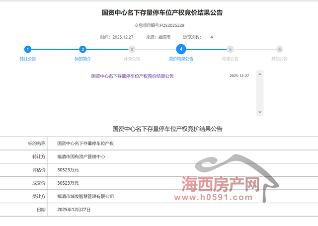 最终,福清市城发智慧管理有限公司以底价30523万元竞得福清4968个车位。