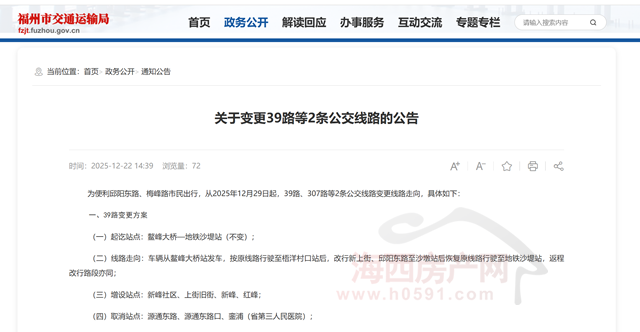 海西房产网(微信公众号:fjhxfcw)消息:12月22日, 福州市道路运输事业发展中心发布“关于变更39路等2条公交线路的公告”。