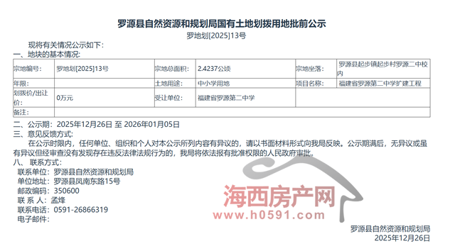 海西房产网(微信公众号:fjhxfcw)消息:12月26日,罗源县自然资源和规划局发布一则国有土地划拨用地批前公示。
