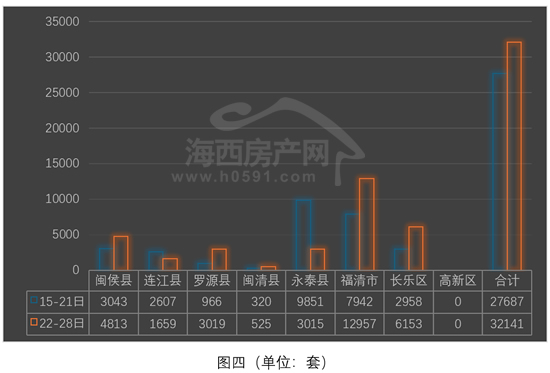 图四为2025年12月15日-28日福州下辖八县(市)区住宅签约面积对比图。上周福州八县(市)区住宅签约32141㎡,环比前一周增加4454㎡,增幅为16.08%。