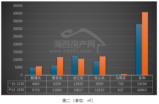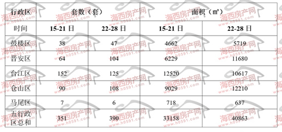 “鼓楼区”和“马尾区”位列四、五两位,上周分别签约5719㎡和637㎡,环比前一周一升一降。