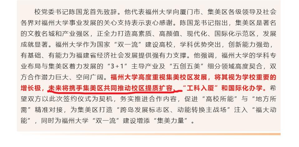福州大学党委书记陈国龙在致辞中表示,福州大学的学科专业布局与集美区着力发展的“3+1”主导产业及“五创五美”细分领域高度契合,双方合作潜力巨大、空间广阔。福州大学高度重视集美校区发展,将其视为学校重要的增长极,未来将携手集美区共同推动校区提质扩容、“工科入厦”和国际化办学。