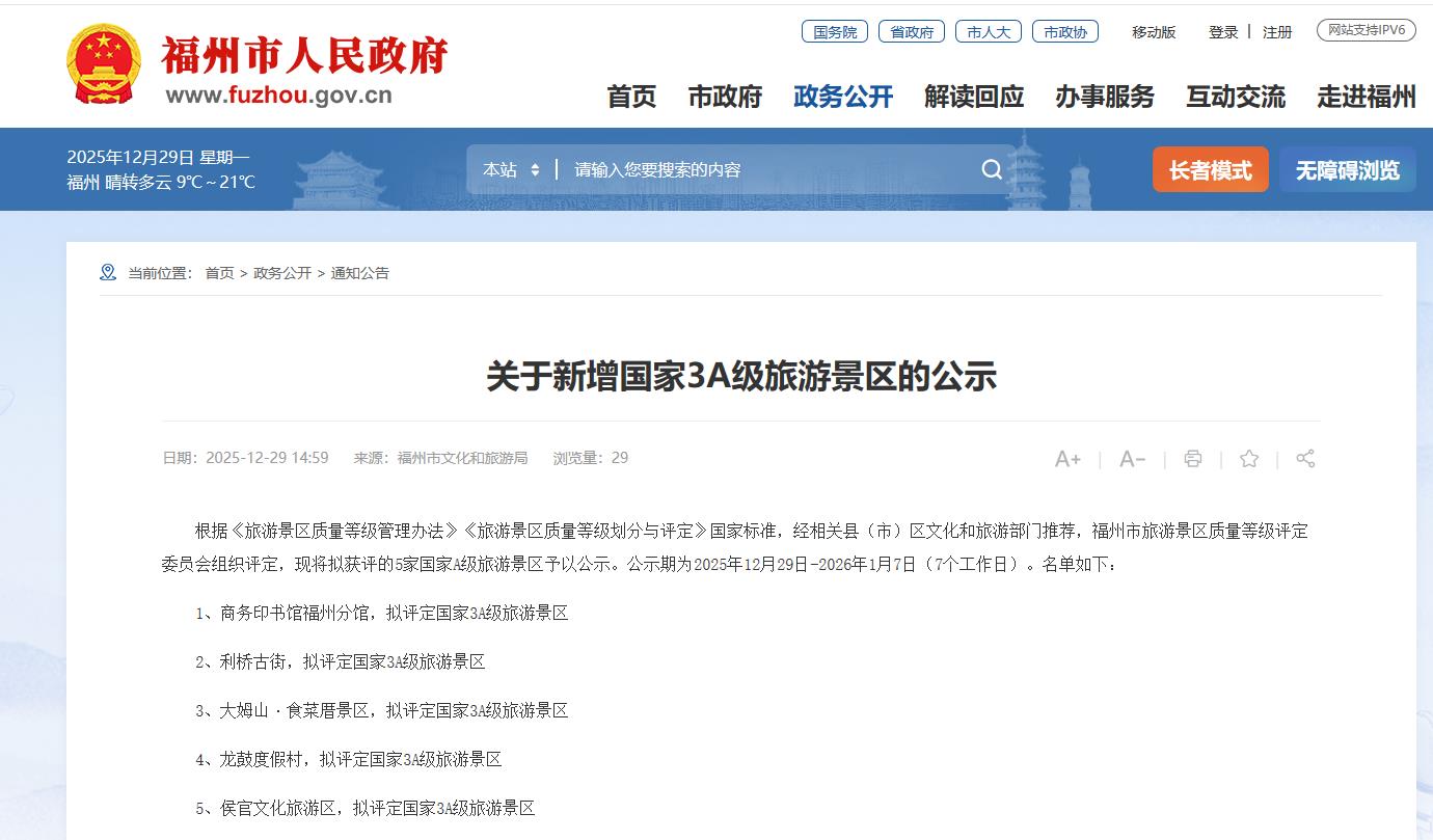 根据《旅游景区质量等级管理办法》《旅游景区质量等级划分与评定》国家标准,经相关县(市)区文化和旅游部门推荐,福州市旅游景区质量等级评定委员会组织评定,现将拟获评的5家国家A级旅游景区予以公示。公示期为2025年12月29日-2026年1月7日(7个工作日)。名单如下:
