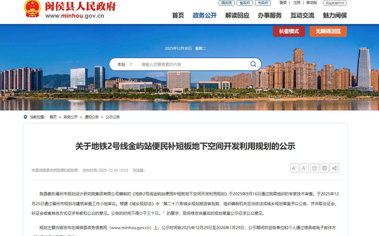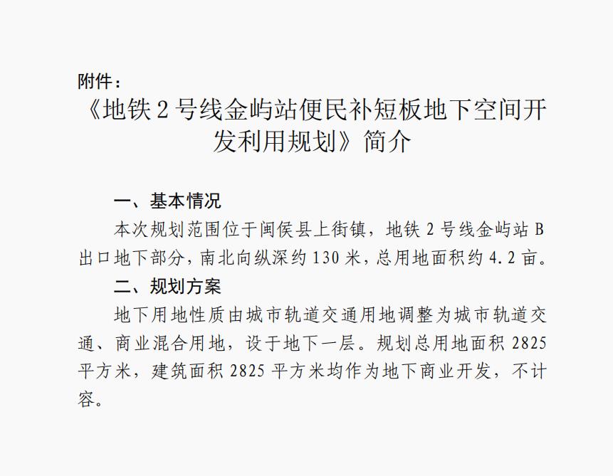 我县委托福州市规划设计研究院集团有限公司编制的《地铁2号线金屿站便民补短板地下空间开发利用规划》于2025年9月16日通过我局组织的专家技术审查。于2025年12月25日通过福州市规划与建筑审查工作小组审议。
