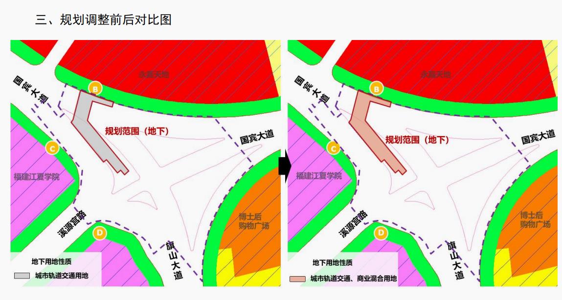 地下用地性质由城市轨道交通用地调整为城市轨道交通、商业混合用地,设于地下一层。规划总用地面积 2825平方米,建筑面积 2825 平方米均作为地下商业开发,不计容。