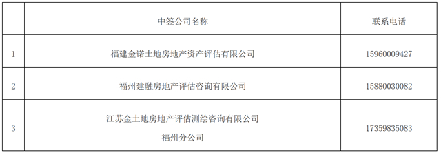 本次摇号根据《通知》相关规定,福州市住房和城乡建设局公示的福州市房屋征收评估机构库中的46家评估机构均参加了本次摇号,采用智能随机摇号系统并当场公布结果,实行全程录像备查,确保各环节公平、公正、公开,共产生3家中签公司,分别为:福建金诺土地房地产资产评估有限公司、福州建融房地产评估咨询有限公司、江苏金土地房地产评估测绘咨询有限公司福州分公司。