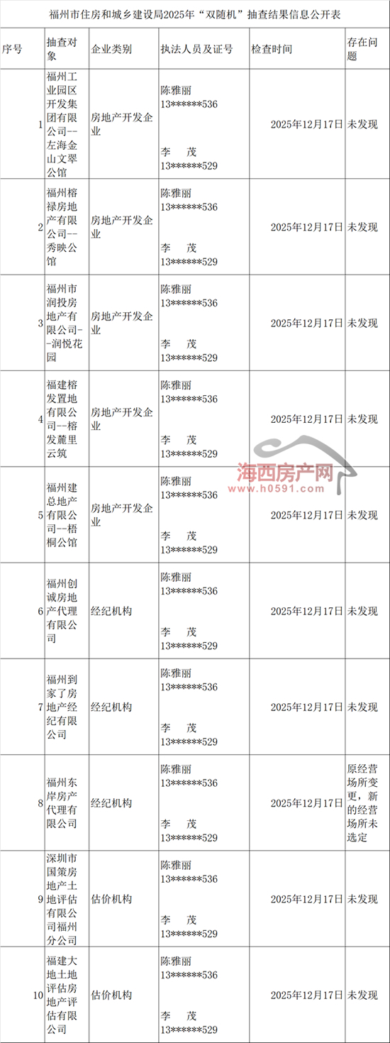 海西房产网(微信公众号:fjhxfcw)消息:12月30日,福州市住房和城乡建设局官网发布2025年“双随机”抽查结果信息公开表。