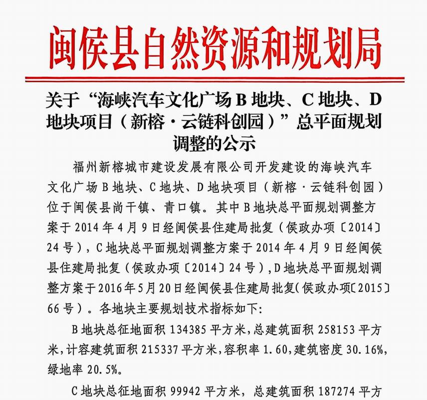 福州新榕城市建设发展有限公司开发建设的海峡汽车文化广场B地块、C地块、D地块项目(新榕·云链科创园)位于闽侯县尚干镇、青口镇。其中B地块总平面规划调整方案于2014年4月9日经闽侯县住建局批复(侯政办项〔2014〕24号),C地块总平面规划调整方案于2014年4月9日经闽侯县住建局批复(侯政办项〔2014〕24号),D地块总平面规划调整方案于2016年5月20日经闽侯县住建局批复(侯政办项〔2015〕66号)。