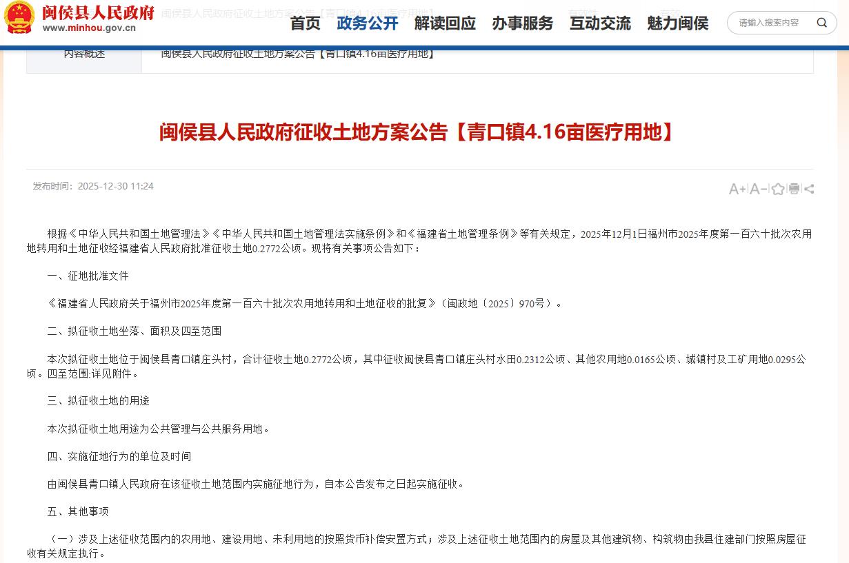 海西房产网(微信公众号:fjhxfcw)消息:2025年12月27日,闽侯县人民政府发布“征收土地方案公告【青口镇4.16亩医疗用地】 ”。