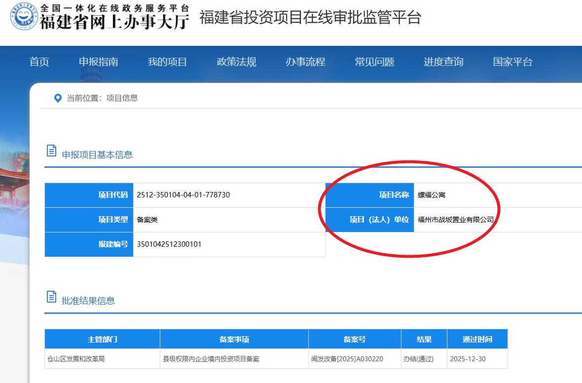 项目报建编号3501042512300101,项目(法人)单位为福州市战坂置业有限公司,备案号闽发改备[2025]A030220。主管部门为福州市仓山区发展和改革局 。
