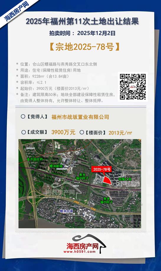 12月2日,在福州市举行的年度第十一轮土地拍卖中,经过1轮竞价,59号竞买人福州市战坂置业有限公司以底价3900万竞得福州宗地2025-78号,楼面地价2012.50元/㎡。