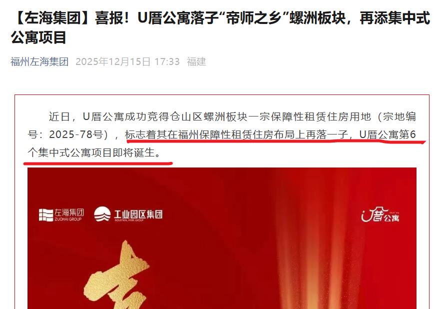 12月15日,福州左海集团对外透露,近日U厝公寓成功竞得仓山区螺洲板块一宗保障性租赁住房用地(宗地编号:2025-78号),标志着其在福州保障性租赁住房布局上再落一子,U厝公寓第6个集中式公寓项目即将诞生。