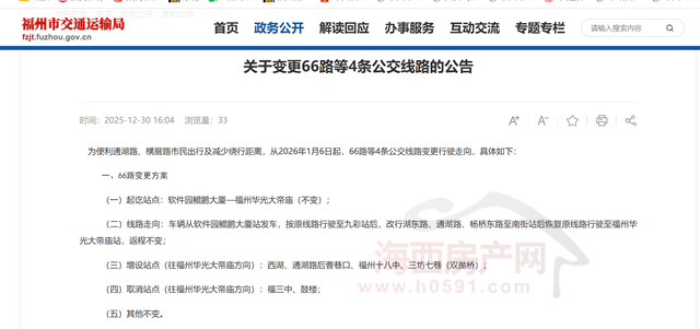 2025年12月30日,福州市道路运输事业发展中心发布“关于变更66路等4条公交线路的公告”。