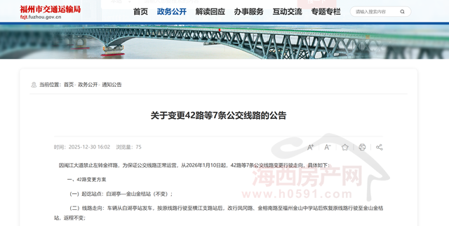2025年12月30日,福州市道路运输事业发展中心发布“关于变更42路等7条公交线路的公告”。