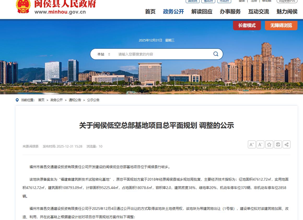 海西房产网(微信公众号:fjhxfcw)消息:2025年12月31日,闽侯县政府官网发布“关于闽侯低空总部基地项目总平面规划 调整的公示 ”。