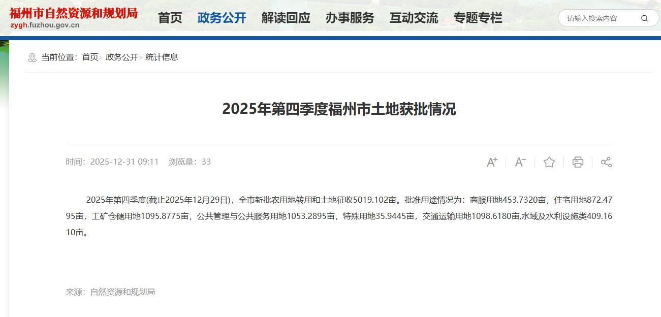 2025年12月(截止2025年12月29日),福州市新批农用地转用和土地征收1601.517亩。批