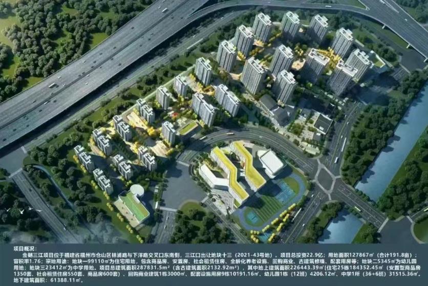 金樾三江项目位于福建省福州市仓山区林浦路与下洋路交叉口东南侧,三江口出让地块十三(2021-43号地)。项目总按资22.9亿,用地面积127867平方米(合计191.8亩),容积率1.76。