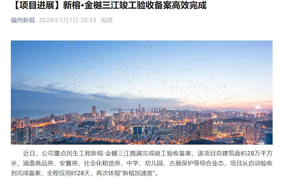 海西房产网(微信公众号:fjhxfcw)消息:据“福州新榕”1月1日报道,近日,公司重点民生工程新榕·金樾三江圆满完成竣工验收备案,该项目总建筑面积28万平方米,涵盖商品房、安置房、社会化租赁房、中学、幼儿园、古厝保护等综合业态,项目从启动验收到完成备案,全程仅用时28天,再次体现“新榕加速度”。
