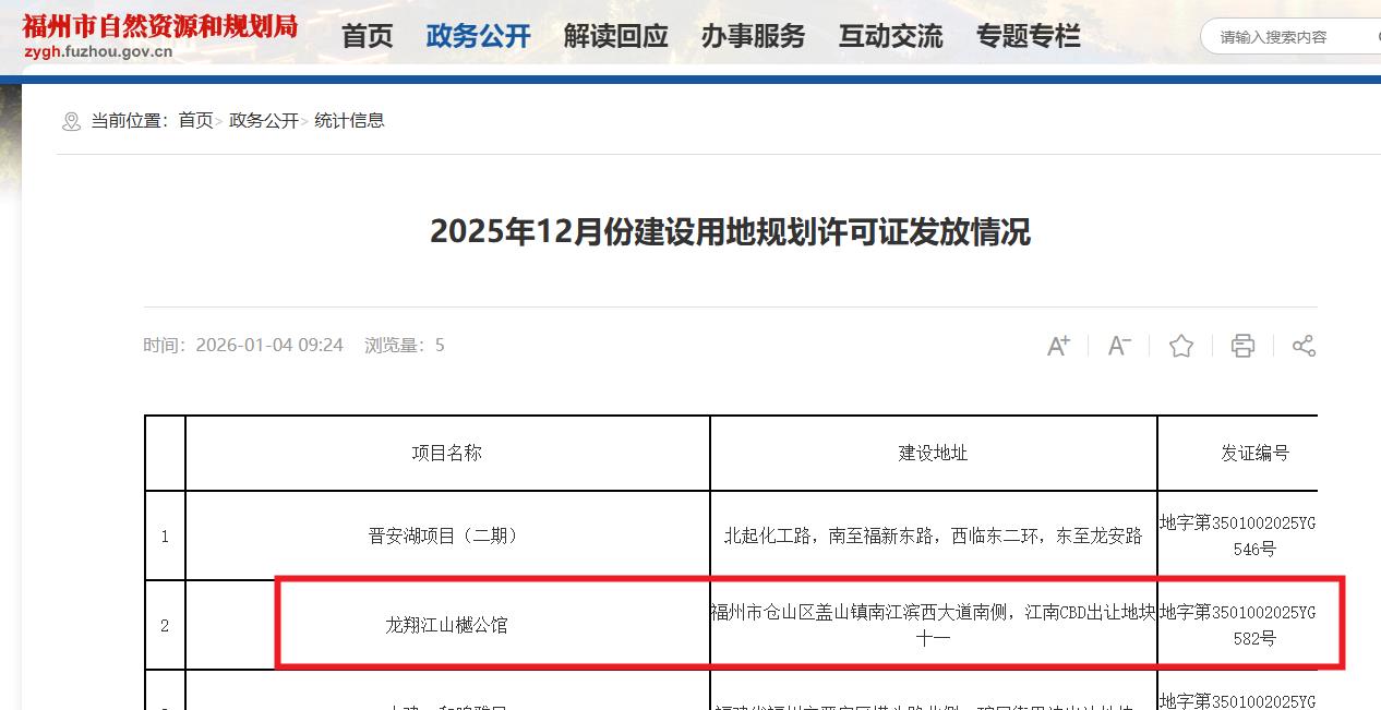 其中,龙翔江山樾公馆,位于福州市仓山区盖山镇南江滨西大道南侧,江南CBD出让地块十一,用地面积17233平米,建设单位为福州兴景置业有限公司;地字第3501002025YG0147582号,发证日期为2025年12月12日。