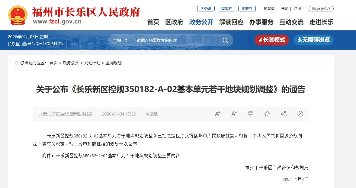 海西房产网(微信公众号:fjhxfcw)消息:2025年1月4日,福州市长乐区自然资源和规划局发布“关于公布《长乐新区控规350182-A-02基本单元若干地块规划调整》的通告 ”。