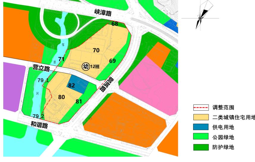 调整营立路西段线,调整后A-02-70地块用地性质为二类城镇住宅用地(R2/070102),幼儿园图标控制,班级数12班;A-02-80部分地块为供电用地(U12/1303),为户内式变电站;A-02-81地块为二类城镇住宅用地(R2/070102)。