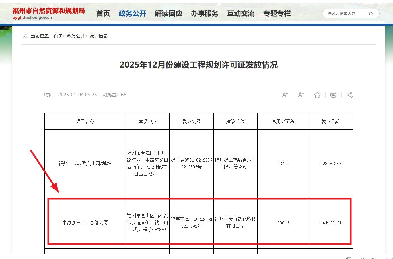 其中,中海创三江口总部大厦已取得建设工程规划许可证,发证文号为建字第3501002025GG0217592号,发证日期为2025年12月15日。该项目位于福州市仓山区南江滨东大道南侧,铁头山北侧,福乐C-03-B,建设单位为福州福大自动化科技有限公司,总用地面积10032平方米。