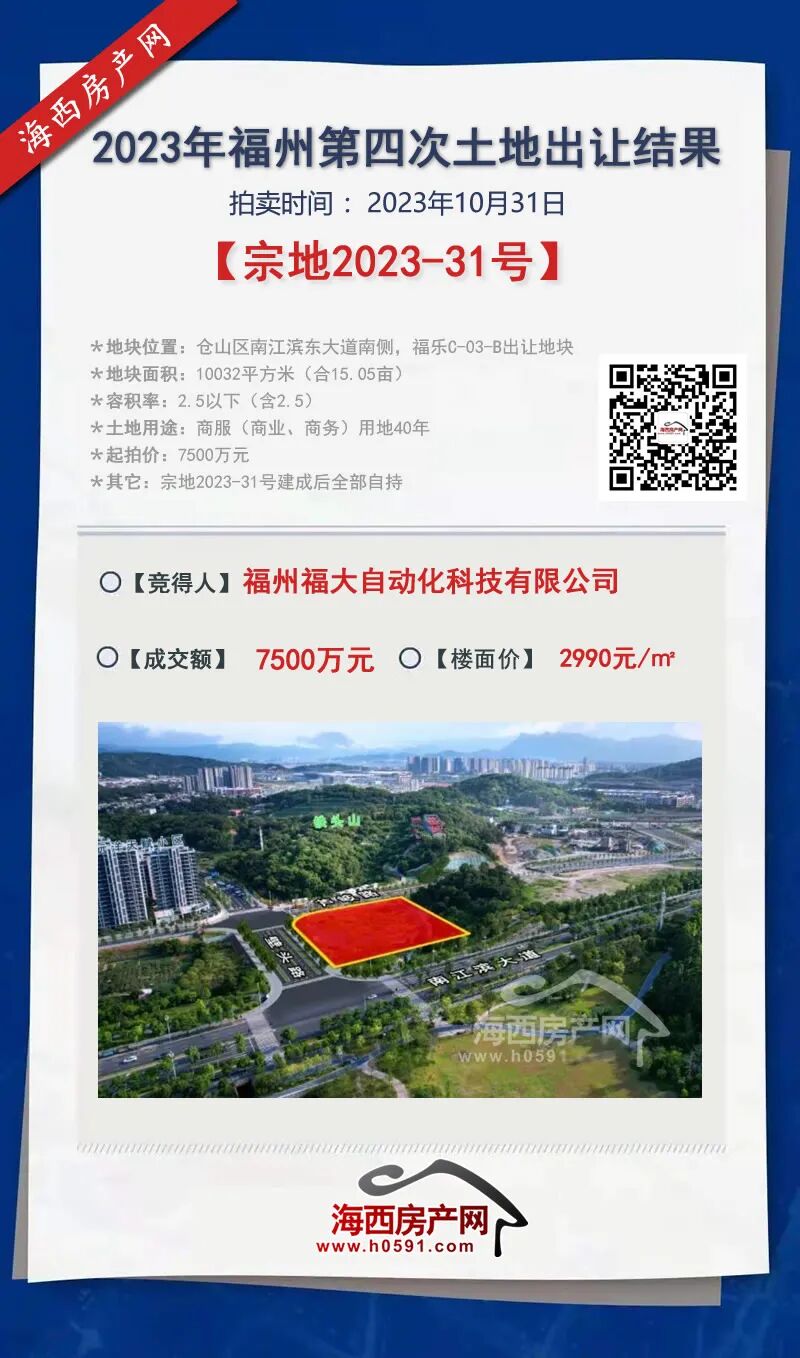 2023年10月31日,福州举行了今年第四次土拍活动。其中,位于仓山区三江口福乐C-03-B出让地块(宗地2023-31号),由福州福大自动化科技有限公司以底价7500万竞得该地块,成交楼面价2990元/㎡。