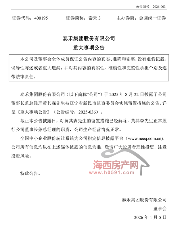 海西房产网(微信公众号:fjhxfcw)消息:1月5日,泰禾集团发布一则重大事项公告。