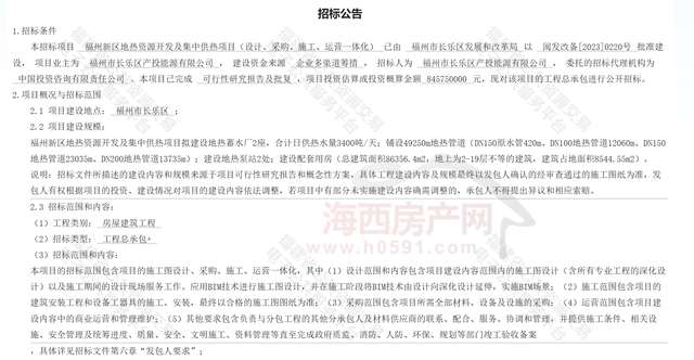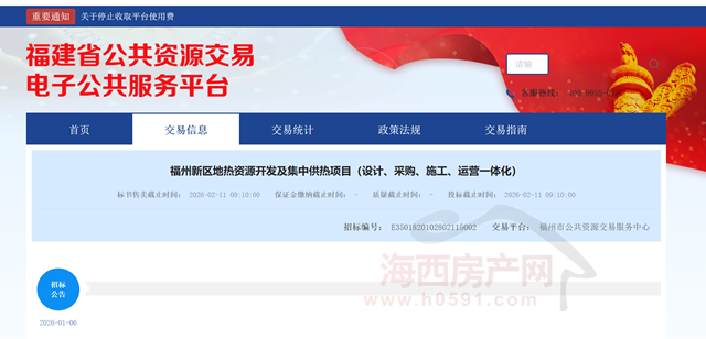 海西房产网(微信公众号:fjhxfcw)消息:1月6日,福建省公共资源交易电子公共服务平台发布“福州新区地热资源开发及集中供热项目(设计、采购、施工、运营一体化)招标公告”。